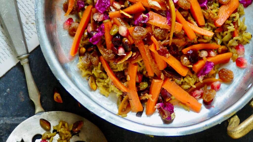 Servér risen toppet op på et fad og læg ”fyldet” ovenpå. Drys med kerner af granatæble.
