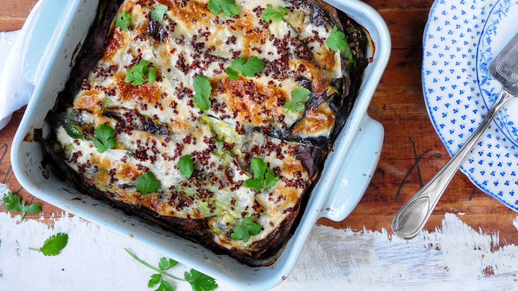 Læg retten sammen i et ovnfast fad: læg først et lag spidskålsblade, derefter et lag svampe, et lag pesto og lidt quinoa. Dryp med 1/3 af sovsen.