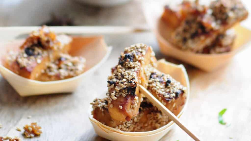 Inden serveringen grilles tofuen: tag stykkerne op af marinaden og rør 1 spsk kartoffel- eller maizenamel i marinaden. Vend tofustykkerne i marinaden og derefter i sesamfrø.